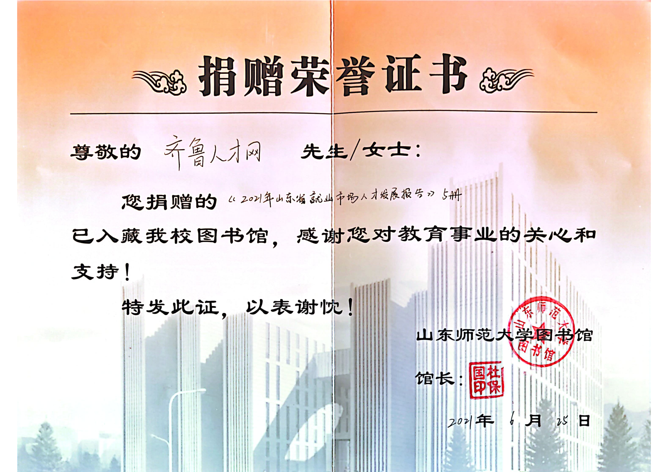山东师范大学捐赠荣誉证书