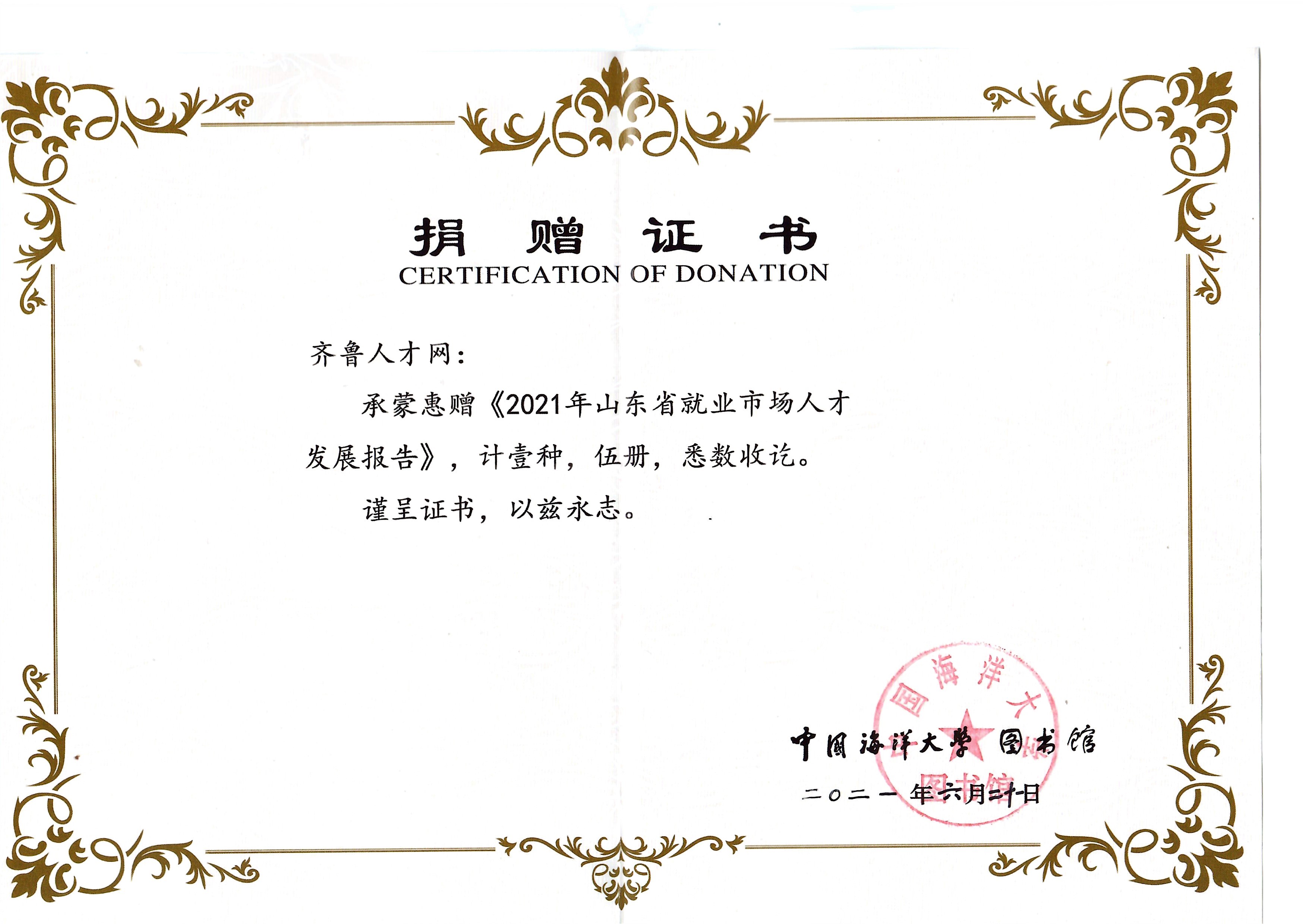 中国海洋大学捐赠荣誉证书